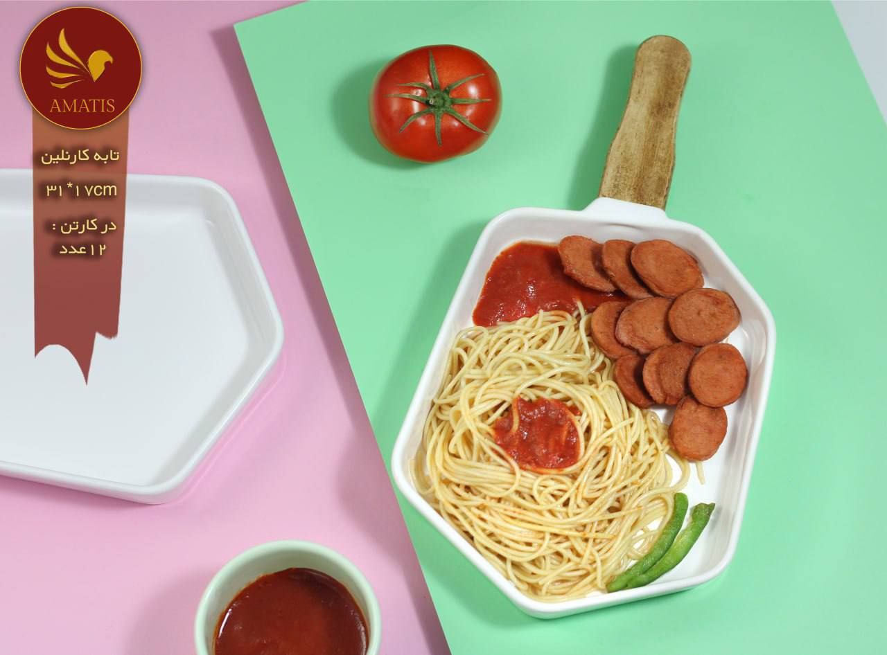 خانه ظرف چینی و سرامیک دیس رولت خوری سینی تابه سرامیک دسته چوبی ذوزنقه