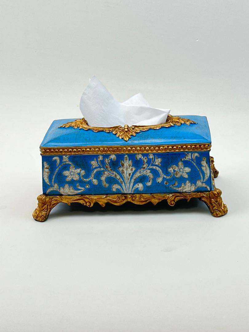 جا دستمالی لوکس با طراحی کلاسیک و رنگآمیزی آبی و طلایی، انتخابی بینظیر برای زیباتر کردن میز پذیرایی، کنسول یا دکور منزل است. جزئیات برجسته و پایههای منقش، جلوهای سلطنتی و چشمنواز به این محصول دادهاند.
