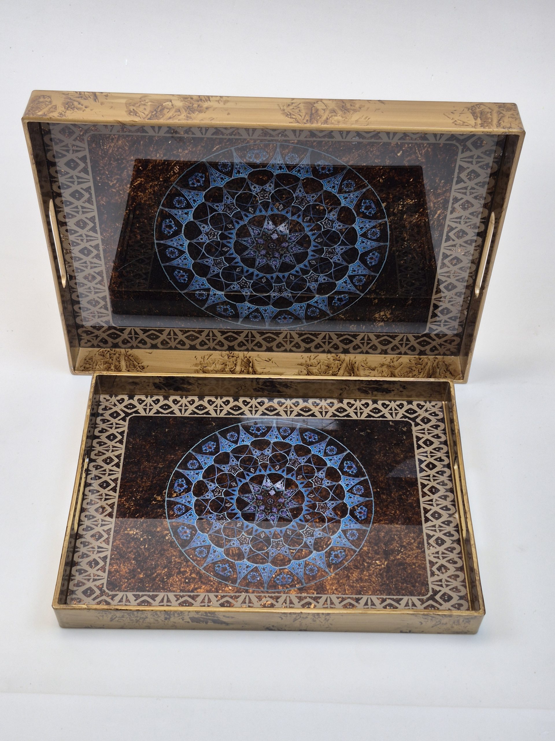 از جعبه دستمال گرفته تا سینی پذیرایی و جعبه‌های چندمنظوره، همه با طراحی‌های الهام‌گرفته از نقش‌ونگار فرش ایرانی یا طرح‌های خاص، و با روکش رزین شفاف و مقاوم، ساخته شده‌اند تا هم کاربردی باشند، هم ماندگار و متفاوت.